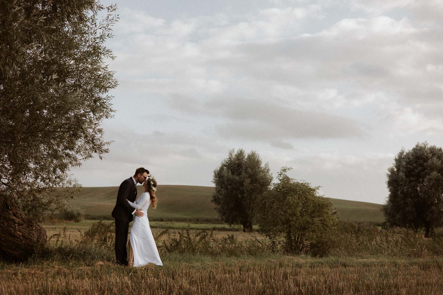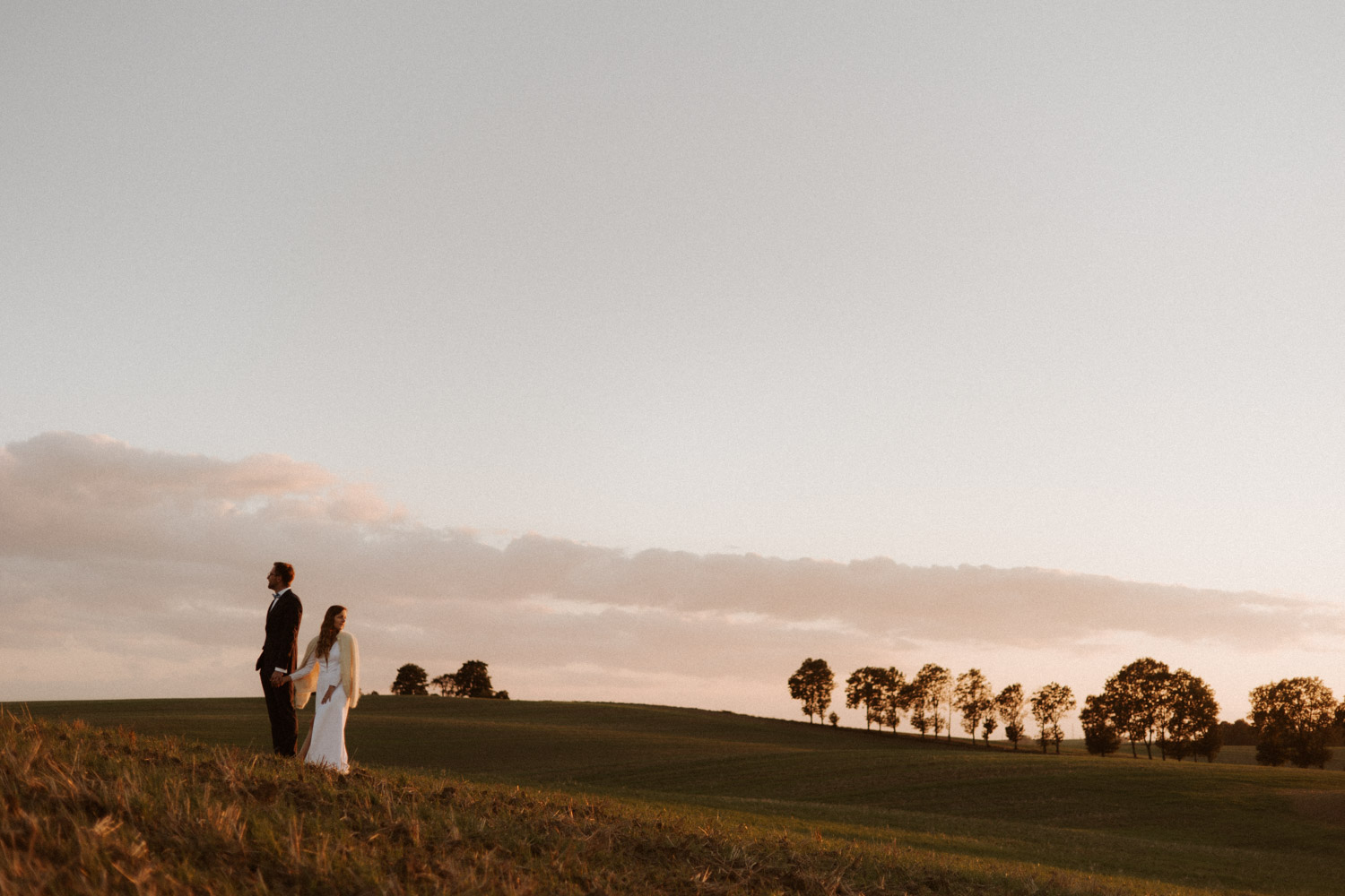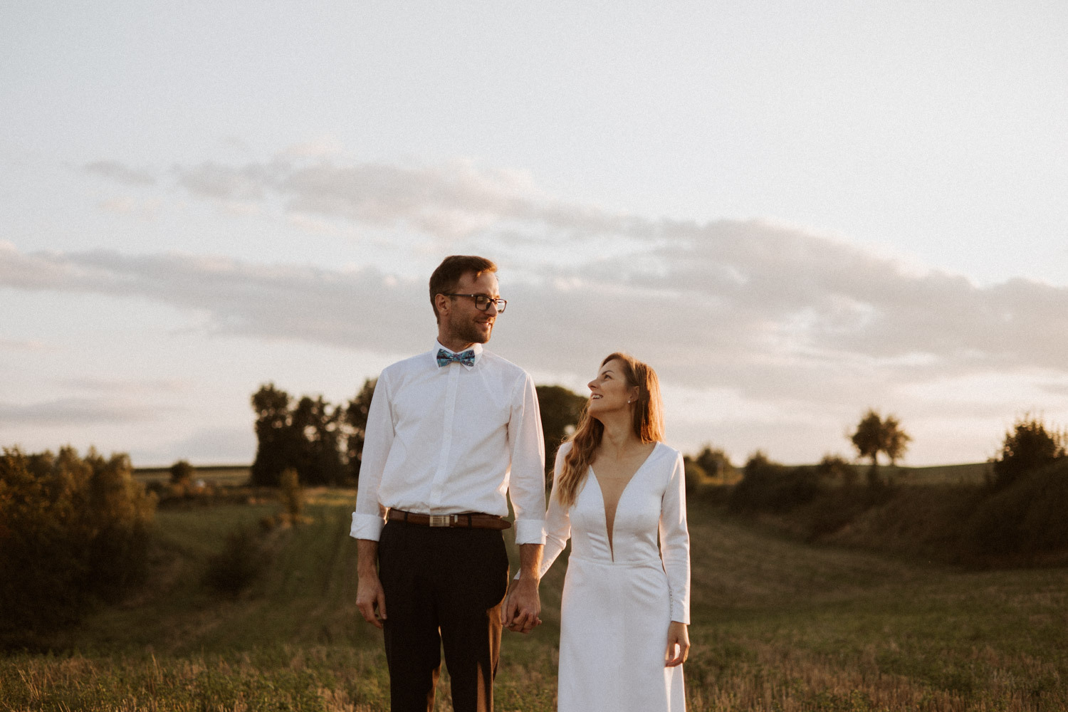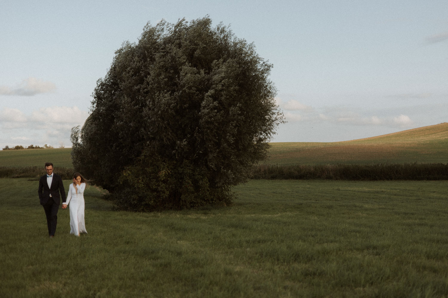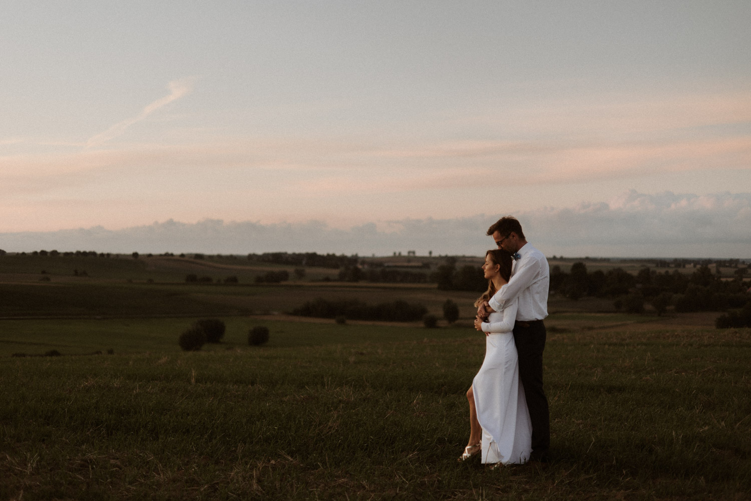 Sesję ślubną Moni i Piotra wykonaliśmy na polach niedaleko Malborka, co pozwoliło nam nie tylo na bliskie, portretowe ujęcia, ale również dalekie, malarskie plany. Sukienka ślubna Moniki pięknie kontrastowała z wczesno wrześniowymi brązami pól i pagórków wokół.