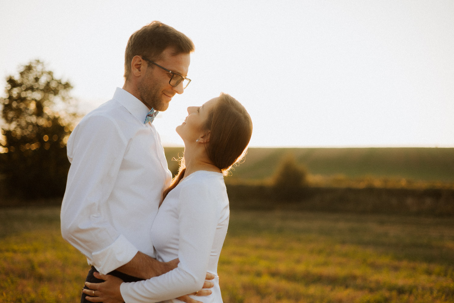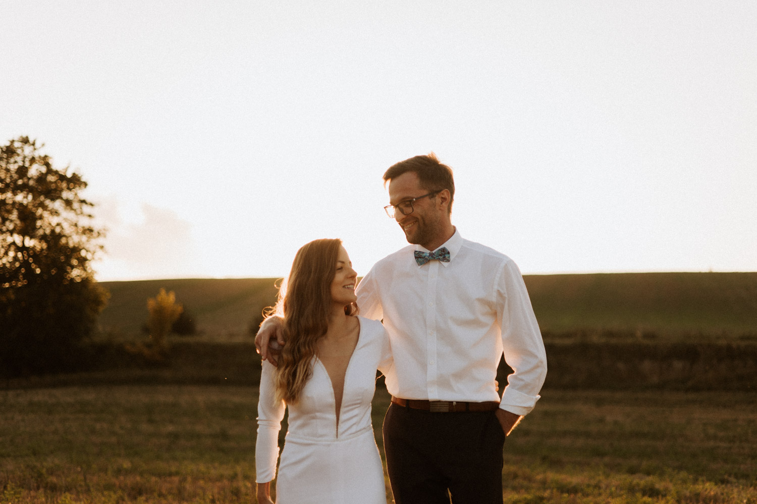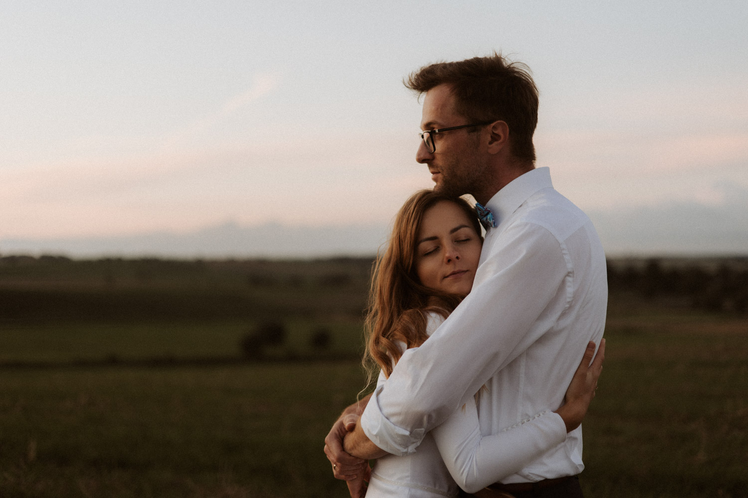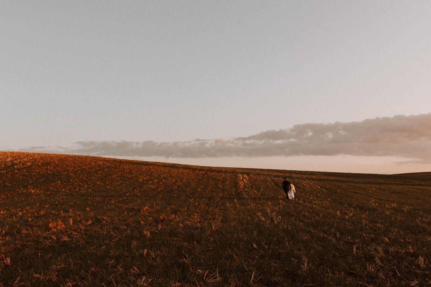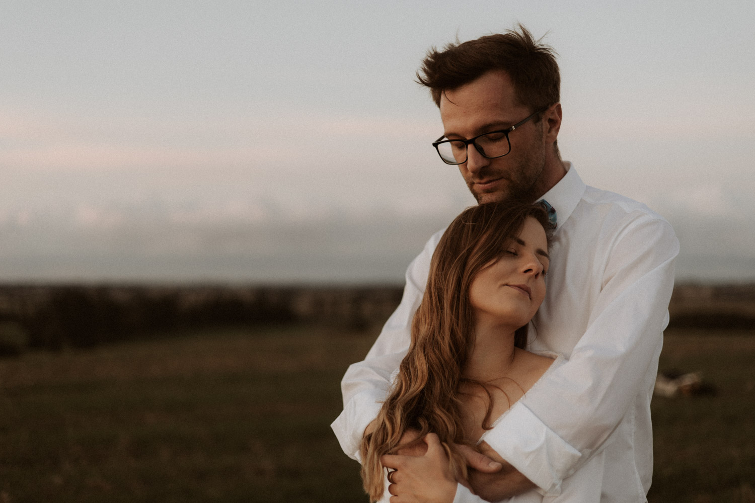 Sesję ślubną Moni i Piotra wykonaliśmy na polach niedaleko Malborka, co pozwoliło nam nie tylo na bliskie, portretowe ujęcia, ale również dalekie, malarskie plany. Sukienka ślubna Moniki pięknie kontrastowała z wczesno wrześniowymi brązami pól i pagórków wokół.