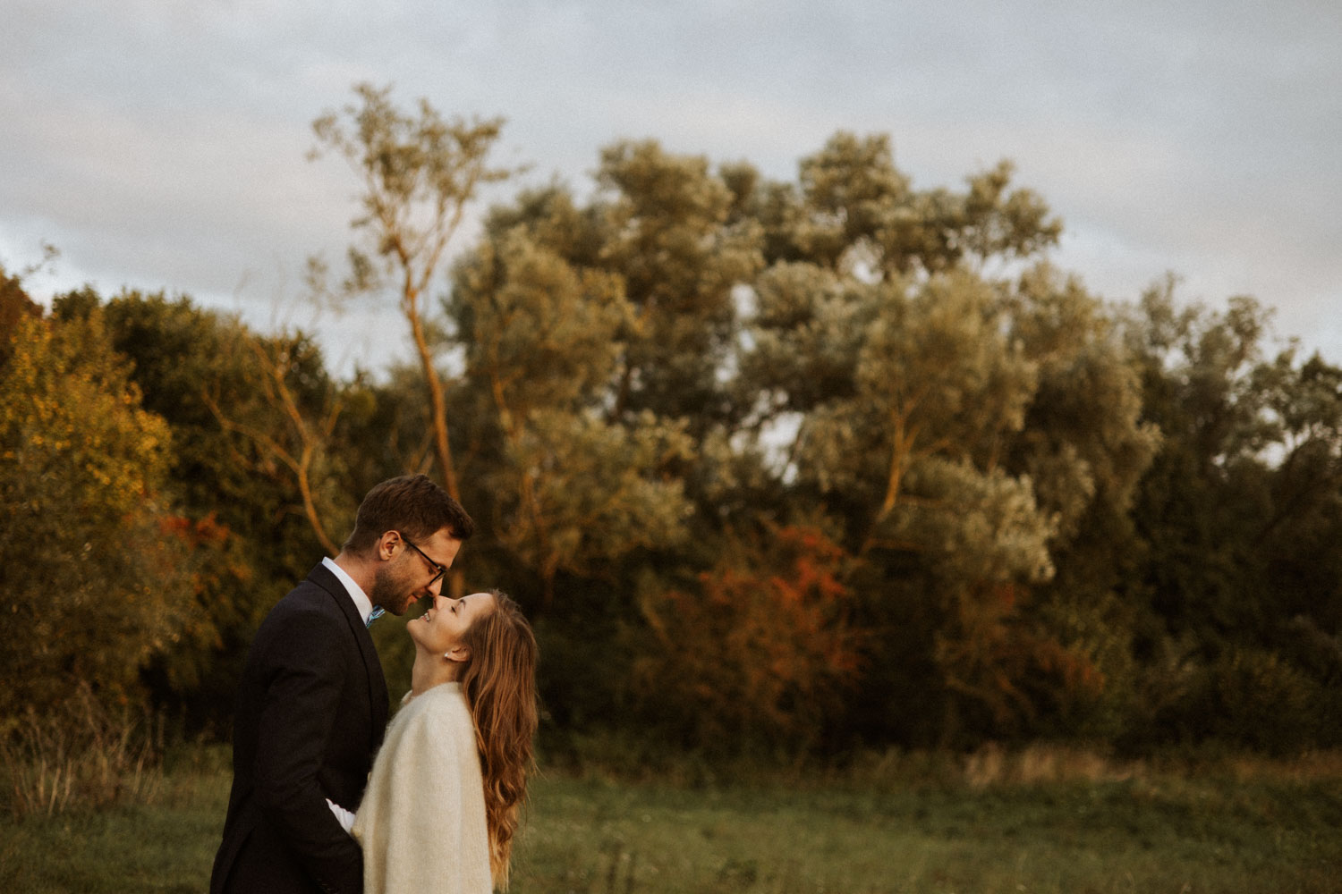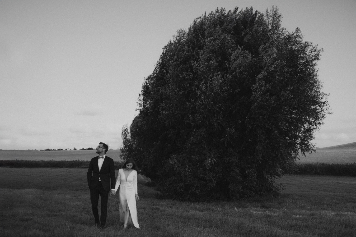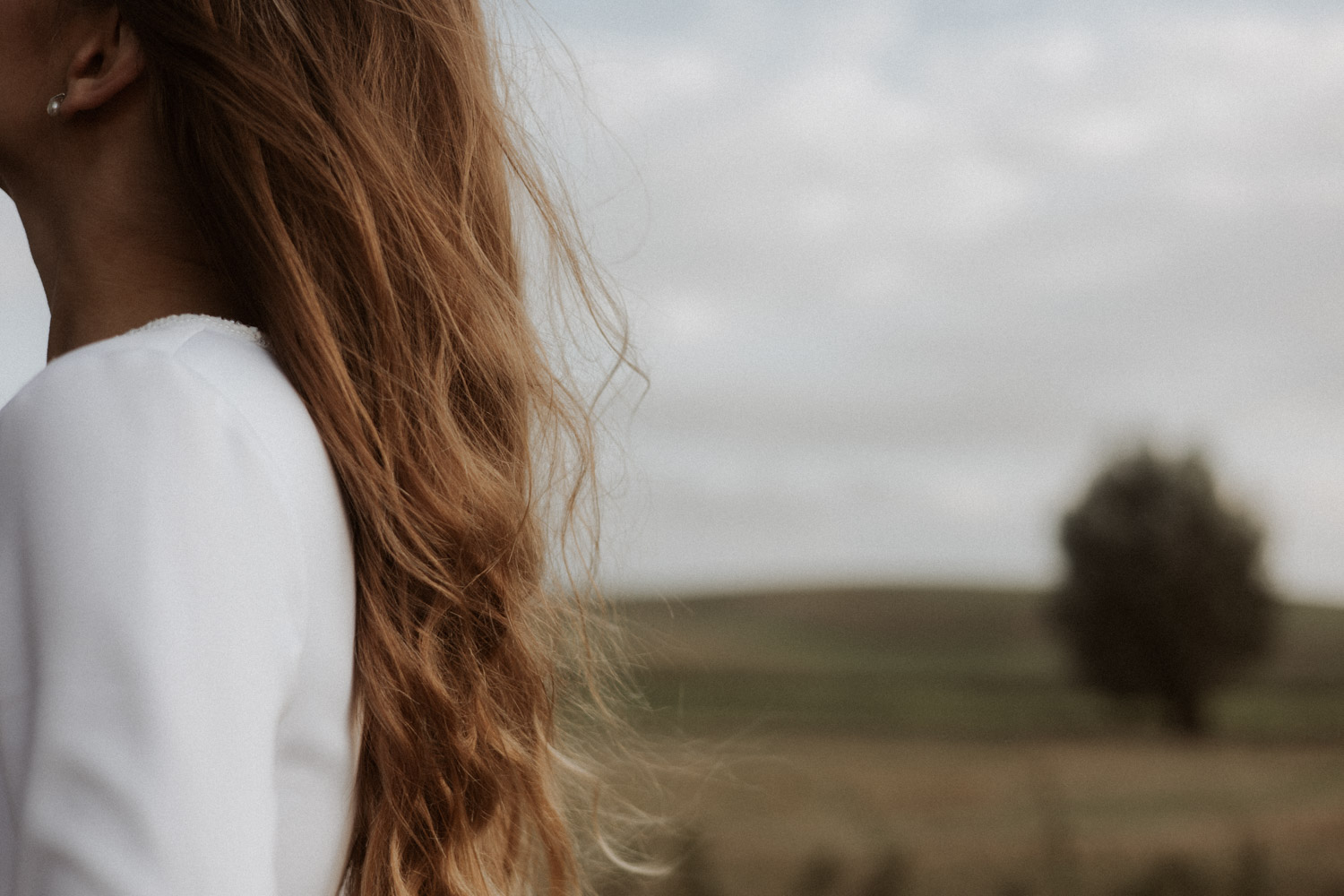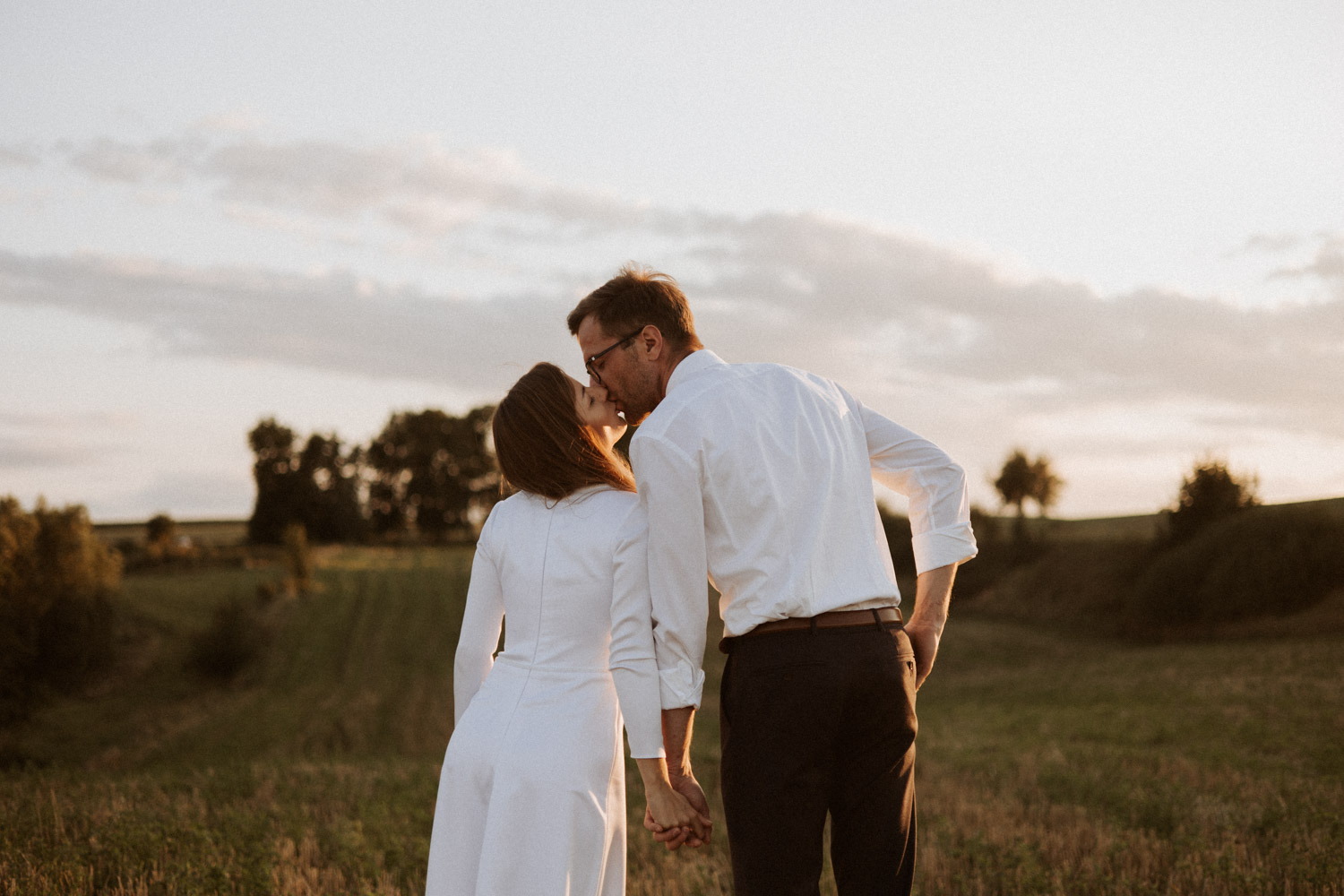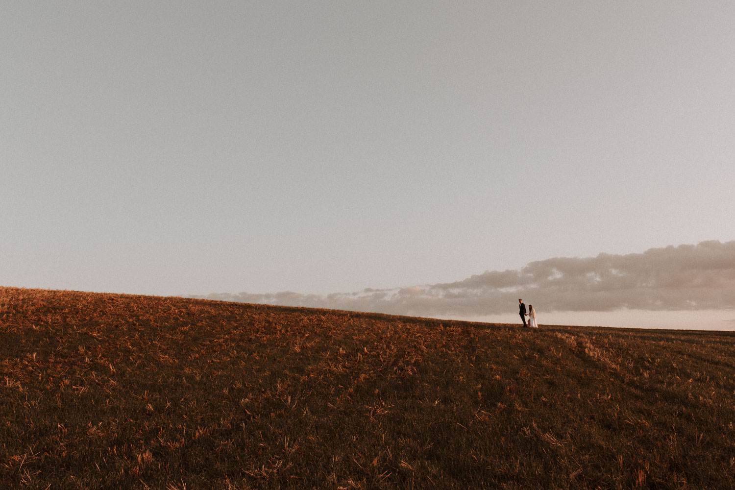 Sesję ślubną Moni i Piotra wykonaliśmy na polach niedaleko Malborka, co pozwoliło nam nie tylo na bliskie, portretowe ujęcia, ale również dalekie, malarskie plany. Sukienka ślubna Moniki pięknie kontrastowała z wczesno wrześniowymi brązami pól i pagórków wokół.